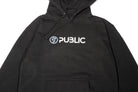 A black hoodie with the PUBLIC logo design, crafted for comfort and everyday wear.